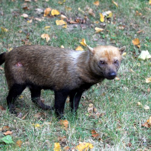 Beskrivelse: Relativt plumpt hundeagtigt rovdyr med meget korte ører, rødbrun pels, mørkebrune ben og hale.