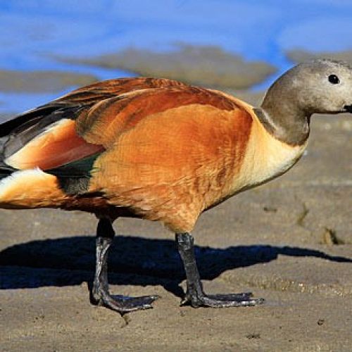 Beskrivelse: Den har en rødlig krop og vinger markant markeret med sort, hvidt og grønt. Hannen har et gråligt hoved, og hunnen har et hvidt hoved. Den kan sammenlignes med Egyptian goose i flyvende tilstand.