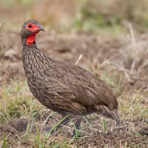 Beskrivelse: Den er brun med et karakteristisk rødt hoved, og er en meget efterspurgt fugl at jage, fordi den er stærk og hurtigflyvende. Den minder om Cape francolin, men de lever ikke i de samme områder. De forekommer oftest i mindre flokke på 8-10 fugle.
